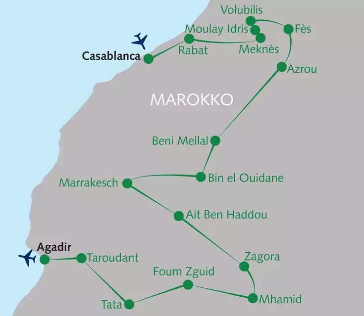1.001 Geschichten vermag das faszinierende Land Marokko zu erzählen: von geheimnisvollen Hafenorten, prachtvollen Königsstädten oder geschäftigen Souks, vom Leben in den ursprünglichen Bergregionen des Atlas, von der wechselvollen Geschichte aus der Zeit der Römer bis hin zur Gegenwart. Mit Jeeps und auf Wanderungen erleben wir die Erg Chégaga-Wüste bevor wir durch die eindrucksvollen Schluchten des Antiatlas an die Atlantikküste gelangen. Komm mit und sei Teil dieser märchenhaften Reise von Casablanca über Marrakesch bis nach Agadir!