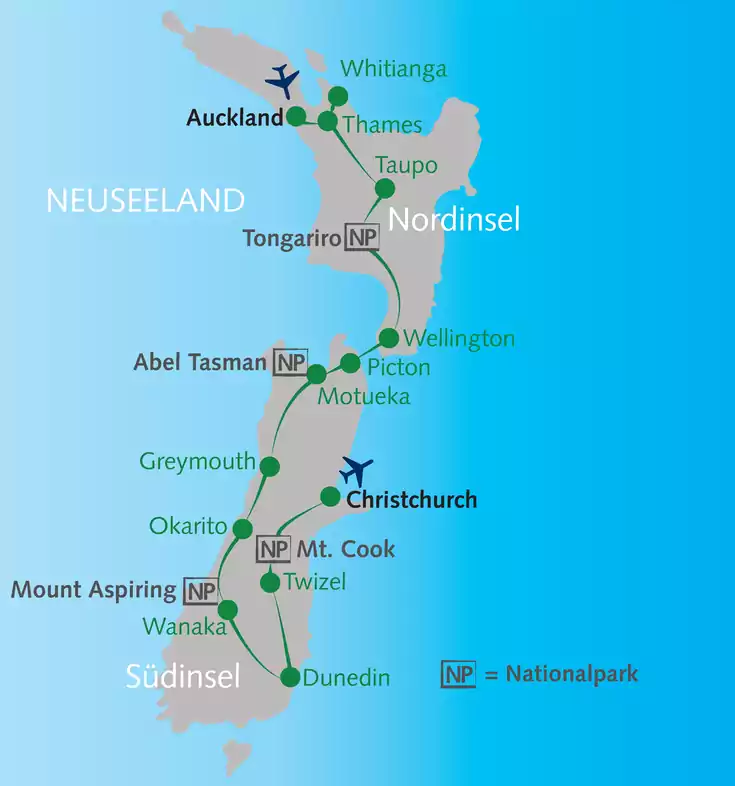 Das andere Ende der Welt, über 20 Flugstunden von Europa entfernt. Ja, das Land bietet tolle Landschaften und Wandermöglichkeiten, aber ist es diese lange Reise wirklich wert? Wer einmal hier war, antwortet meist mit "Ja"! Dich erwartet eine unglaubliche Landschaftsvielfalt auf engstem Raum; quasi ein Kontinent in einem Land: die Alpen, die endlosen Strände, Gletscher, Regenwald und grandiose Seen. Neben tollen Wanderungen erlebst du Neuseeland auch zu Wasser: Rafting-Spaß und Kajak-Abenteuer. Zwischendurch satteln wir auf und genießen die Natur vom Rad aus. Aktiv durch Neuseeland, welcome to paradise!