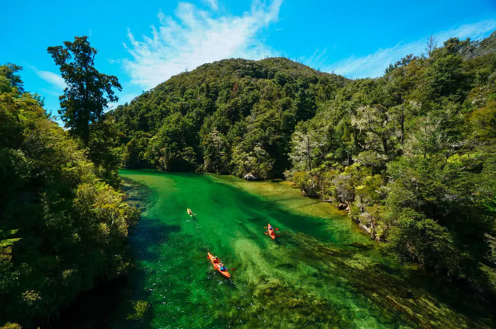 Ein besonderes Erlebnis erwartet uns. Durch das Weinanbaugebiet Marlborough fahren wir zum Abel Tasman-Nationalpark. Goldene Strände, smaragdgrünes, kristallklares Wasser, Steilküsten und eine exotisch anmutende, subtropische Küstenvegetation lassen uns augenscheinlich ins Paradies eintauchen. Zwei Tage lang erkunden wir diese phänomenale Landschaft vom Kajak aus. Mit etwas Glück begegnen uns Delfine oder Robben. 2 Cabin-Übernachtungen.175 km.