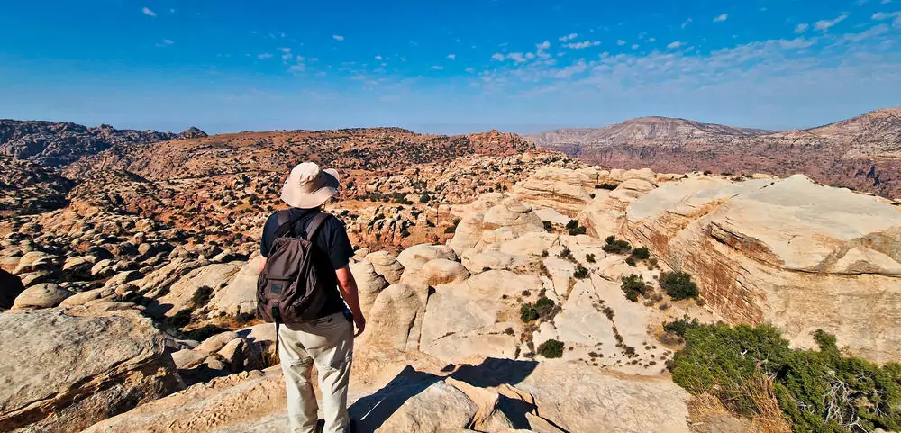 Unser Trekking beginnt mit einer Tagesetappe durch das Wadi Dana, das zum Dana-Nationalpark gehört. Mit Fernblicken über die karge, felsige Landschaft wandern wir zu unserem ersten Zeltcamp. GZ 5-6 Std., +0 m, -900 m. Zeltübernachtung. (F, M, A)