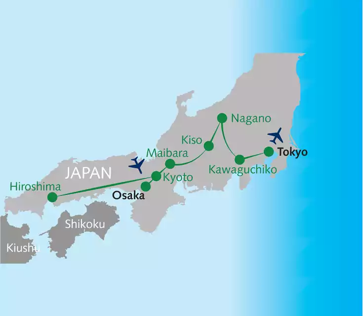 - Gepäcktransport: Separater Hauptgepäckversand (über Nacht) erfolgt an Tag 3: Osaka-Kyoto, Tag 5: Kyoto-Hiroshima, Tag 8: Hiroshima-MatsumotoTag 10: MatsumotoKawaguchiko, Tag 13: Kawaguchiko-Tokyo. Du transportierst nur das Nötigste im Tagesrucksack und reist dadurch im Zug/Shinkansen ganz entspannt.