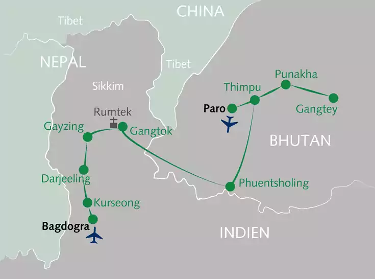 Sikkim - bekannt für Darjeeling-Tee, bengalische Tiger und Himalayagipfel - bezaubert mit bhuddistischen Klöstern, seiner gastfreundlichen Bevölkerung und dem drittgrößten Berg der Welt. Das Königreich Bhutan fasziniert in seiner Abgeschiedenheit zwischen Tibet und Indien mit Landschaftsbildern zwischen subtropischen Regenwäldern und schneebedeckten Himalaja-Gipfeln. Auf dieser Reise erleben wir die kulturellen Höhepunkte Sikkims, kaum berührte Natur sowie die wenig bekannten Traditionen des Drachenreiches Bhutan hautnah. Eine einzigartige und unvergessliche Erfahrung!