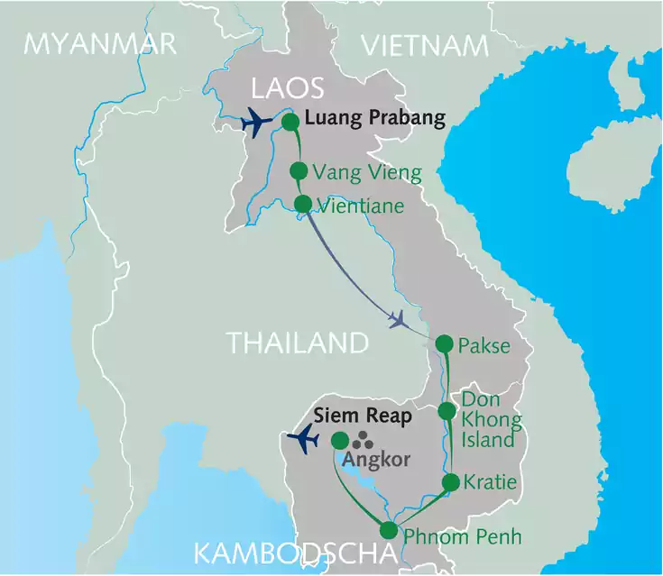 Laos und Kambodscha – zwei Perlen auf dem Weg des mächtigen Mekong und eine Welt voller Traditionen. Bei unseren Besuchen weltberühmter Kulturstätten wie den Tempelanlagen von Angkor begeben wir uns auf eine Zeitreise ins alte Khmer-Reich. Wir erleben eine Atmosphäre wie im Märchen und fernöstliche Momente der Ruhe, während wir die Schätze dieser lange Zeit versunkenen Welt bestaunen. Unser Erlebnis wird abgerundet von grandiosen Landschaften, quirligen Metropolen und liebenswerten Menschen. Los geht´s!