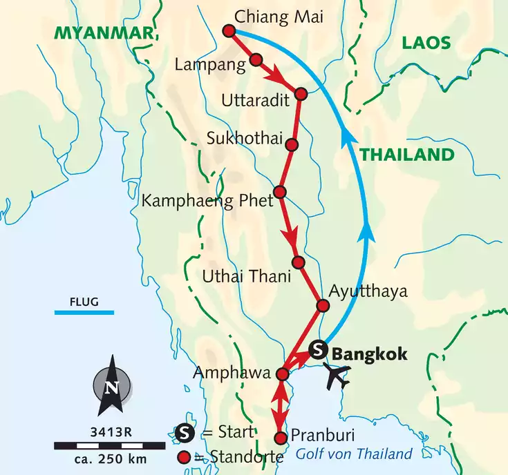 Kaum ein anderes Reiseland fasziniert mit solch exotischer Vielfalt, reicher Geschichte und üppigen Landschaften wie Thailand. Unsere Reise beginnt in Bangkok. Von den Bergen und Wäldern des Nordens bei Chiang Mai folgen wir dem majestätischen Fluss Chao Praya. Wir erleben uralte, lebendige siamesische Kultur zwischen traditioneller Dorfgemeinschaft und Moderne, treffen auf freundliche, lebenslustige Menschen und bewundern prachtvolle buddhistische Tempel. Komm mit und probier die exotischen Köstlichkeiten auf farbenprächtigen Märkten!