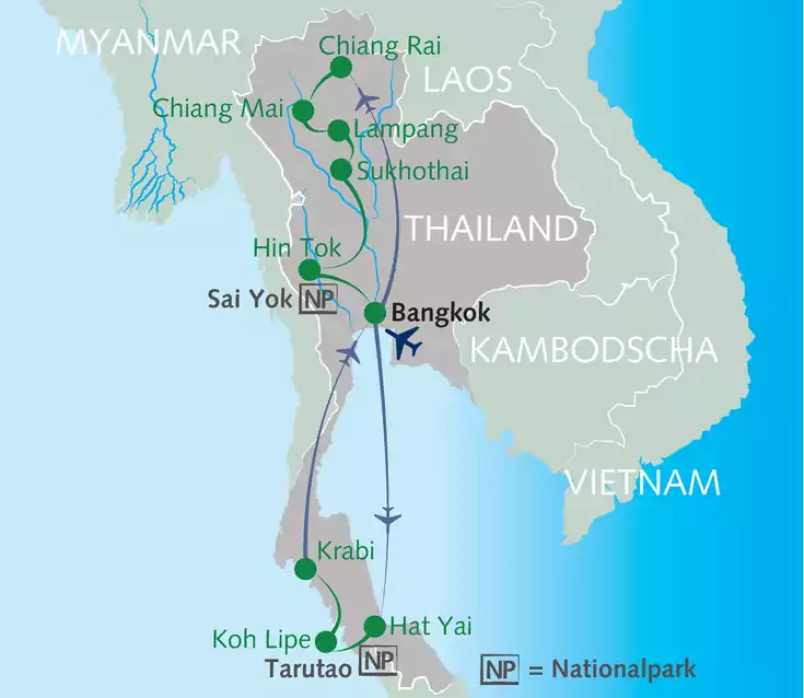 Was ist typisch für Thailand? Diese Reise! Sie kombiniert die sehenswertesten Schätze mit hochwertigen Unterkünften. Dazu der perfekte Mix aus Natur und Kultur. Wir wandern durch Dschungel zu den Bergstämmen im Goldenen Dreieck. Lassen uns von den alten Königsstädten Zentralthailands und dem Kwai-Fluss beeindrucken. Schwimmen mit dem Strom in der Hauptstadt. Und entspannen an den weißen Traumstränden des Südens. Eine kontrastreiche Reise zwischen bewegter Geschichte und exotischer Moderne von Nord nach Süd. Kommst du mit?