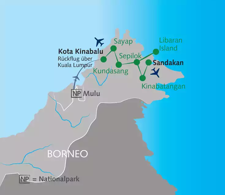 Du liebst die Natur und exotische Tiere? Dann ist Borneo ein wahres Paradies für dich! In einem der ältesten Naturräume der Welt erwarten uns gigantische Höhlensysteme und immergrüne Regenwälder. Im dichten Dschungel entdecken wir die einzigartige Tierwelt zu Fuß sowie auf Bootsfahrten. Dabei kommen wir den Orang-Utans und Nasenaffen ganz nahe. Auf Libaran Island lernen wir die bunte Unterwasserwelt kennen. Entspannung am Strand, Expeditionen im Dschungel, Begegnung mit dem Volk der Dusun: Freu dich auf das Abenteuer deines Lebens!
