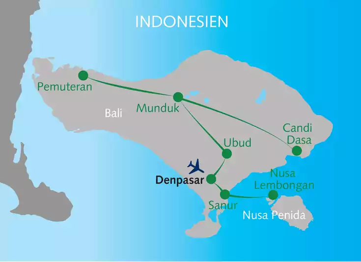 Du suchst eine abwechslungsreiche Reise, die kein Highlight auslässt? Leuchtend grüne Reisterrassen und der magische Sonnenaufgang auf dem Mount Batur. Zu Fuß neue Pfade durch ursprüngliche Dörfer erkunden. In den aufwendig verzierten Tempeln in den Hinduismus eintauchen. Du willst noch mehr? Die bunte Unterwasserwelt um Menjangan entführt uns in eine andere Welt. Die Inseln Nusa Lembongan und Nusa Penida zeigen uns grandiose Naturphänomene. Ein paar ruhige Stunden am Strand haben wir uns schließlich verdient ...