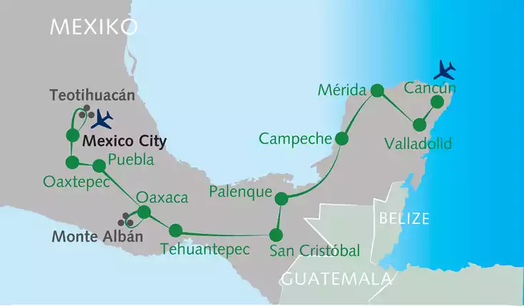 Indigene Hochkulturen, wilde Gebirgszüge und tropischer Urwald – von Mexico City bis Yucatán erleben wir ein Feuerwerk der Vielfalt. Das Erbe der Maya und Azteken beeindruckt mit monumentalen Pyramiden und kunstvollen Tempelanlagen. Koloniale Prachtbauten schmücken die Plätze pulsierender Städte. Auf bunten Märkten begegnen wir der herzlichen Gastfreundschaft. ¡Vámonos a México!