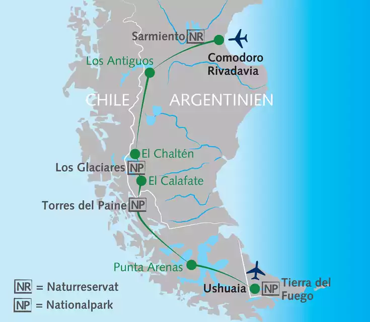 Auf dieser Reise erreichen wir eine maximale Höhe von 1.200 m. Öffentliche Busse in Argentinien und Chile werden meist von Touristen genutzt und entsprechen westeuropäischen Standards. Die Freigepäckmenge auf den Inlandsflügen mit Aerolíneas Argentinas beträgt 15 kg pro Person (Änderungen vorbehalten). Zusatzgepäck kann für wenige EUR pro kg am Schalter hinzugebucht werden Am Lago Posadas teilen sich aus Kapazitätsgründen ggf. jeweils zwei Zimmer ein Bad. Die Zimmer in Chile sind verhältnismäßig klein: Doppelzimmer ca. 3x3 m, Einzelzimmer ca. 2x3 m.
