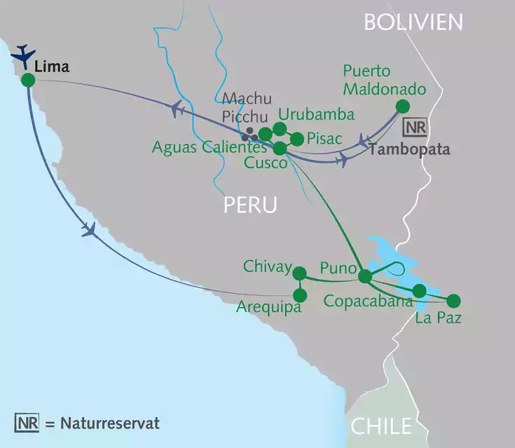 Von Lima nähern wir uns über Chivay (3.635 m) dem Titicacasee (3.870 m). Hier gibt es im Notfall gute medizinische Versorgung und Sauerstoff im Hotel. Aufgrund der Straßenverhältnisse können auch kurz erscheinende Etappen mehrere Stunden in Anspruch nehmen. Auf einzelnen Fahrtstrecken müssen aufgrund von Größen- und Gewichtsbeschränkungen kleinere Busse eingesetzt werden, die über ein geringeres Komfortniveau verfügen. Dies gilt insbesondere in den historischen Stadtzentren. Für den Besuch von Machu Picchu gelten fest definierte, tägliche Besucherlimits. Wir raten daher zu sehr frühzeitiger Buchung und bitten um schnellstmögliche Übermittlung der Passdaten. Details findest du in den Reiseinformationen.
