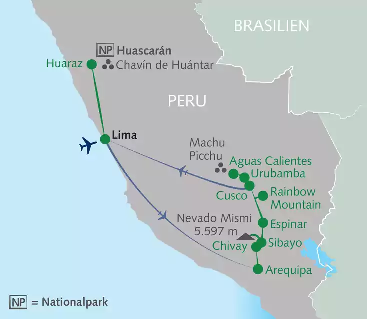 Aufgrund der Straßenverhältnisse können auch kurz erscheinende Etappen mehrere Stunden in Anspruch nehmen. Auf einzelnen Fahrtstrecken müssen aufgrund von Größen- und Gewichtsbeschränkungen kleinere Busse eingesetzt werden, die über ein geringeres Komfortniveau verfügen. Dies gilt insbesondere in den historischen Stadtzentren. Für den kurzen Inka-Trail sowie den Besuch von Machu Picchu gelten fest definierte, tägliche Besucherlimits. Wir raten daher zu sehr frühzeitiger Buchung und bitten um schnellstmögliche Übermittlung der Passdaten. Details findest du in den Reiseinformationen. Wenn dir die Wanderung am 11. Tag aufgrund der großen Höhe (über 5.000 m) zu anstrengend ist, kannst du auf ca. 3.850 m Höhe eine flache Alternativwanderung unternehmen. GZ ca. 2-3 Std.