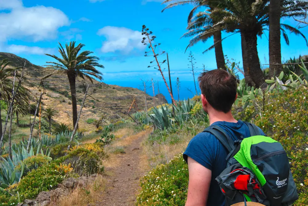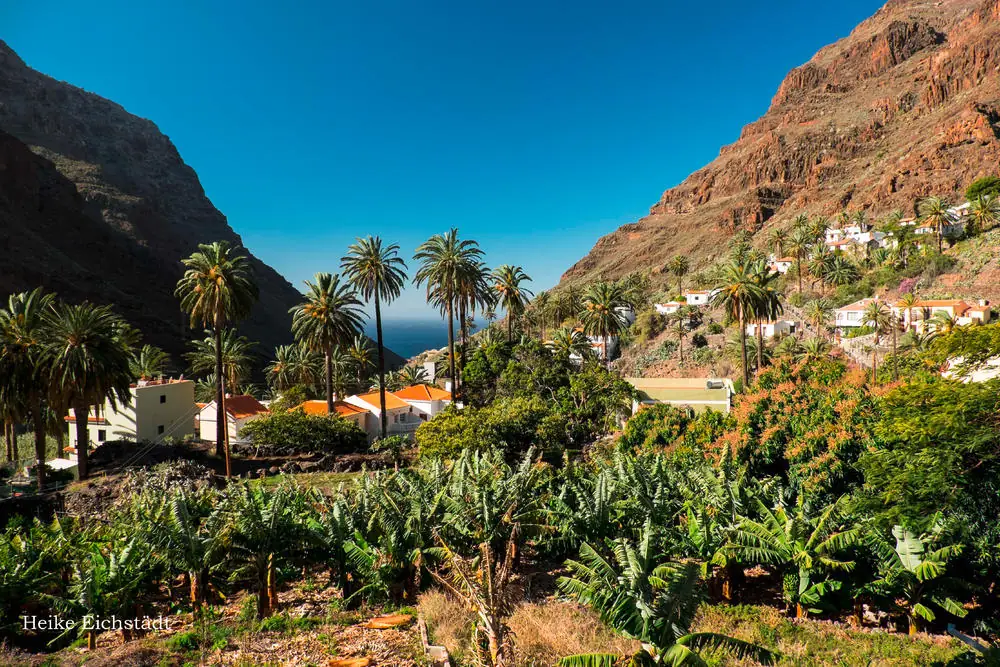 Inmitten steiler Berghänge taucht ein grünes Wunder auf: das abgeschiedene Tal von Benchijigua. Vom Roque Agando windet sich unser Weg durch Palmenhaine und stille Natur bis ins verschlafene Dörfchen Pastrana – ein Ort, der sich seine Ursprünglichkeit bewahrt hat und wie aus der Zeit gefallen wirkt (GZ: 3 1/2 Std., - 700 m).