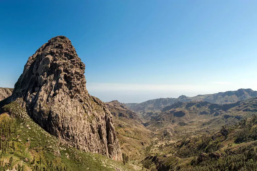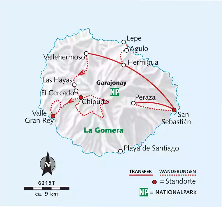 Per Transfer erreichen wir einen Aussichtspunkt außerhalb von San Sebastián. In stetigem Bergab gelangen wir mit Ausblick auf die Inselhauptstadt und die Nachbarinsel Teneriffa zurück zum Hotel (GZ: 3 1/2 Std., - 935 m).