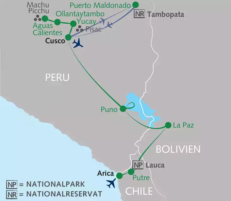 Aufgrund der Straßenverhältnisse können auch kurz erscheinende Etappen mehrere Stunden in Anspruch nehmen. Öffentliche Busse in Chile und Bolivien werden meist von Touristen genutzt und entsprechen westeuropäischen Standards. Auf einzelnen Fahrtstrecken müssen in Peru aufgrund von Größen- und Gewichtsbeschränkungen kleinere Busse eingesetzt werden, die über ein geringeres Komfortniveau verfügen. Dies gilt insbesondere in den historischen Stadtzentren. Für den Besuch von Machu Picchu gelten fest definierte, tägliche Besucherlimits. Wir raten daher zu sehr frühzeitiger Buchung und bitten um schnellstmögliche Übermittlung der Passdaten. Details findest du in den Reiseinformationen. Die Zimmer in Chile sind verhältnismäßig klein: Doppelzimmer ca. 3x3 m, Einzelzimmer ca. 2x3 m.