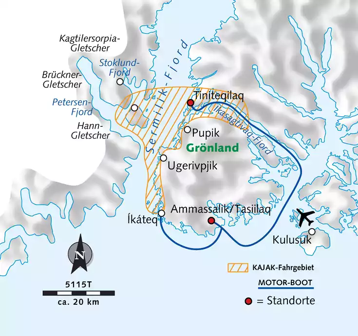 Sieben volle Tage nehmen wir uns Zeit, den schönsten Fjord Ostgrönlands, den Sermilik-Fjord, samt seiner Seitenarme und Nebenfjorde zu erkunden. Unsere genaue Route wird von der Eissituation vorgegeben. Sollte die Eislage es zulassen, queren wir den Sermilik-Fjord vorbei an unzähligen Eisbergen und schlagen unser Lager am Westufer in der Nähe des mächtigen Inlandeises auf. Von hier aus finden wir mit den Seekajaks unseren eigenen Weg zwischen kleinen Inseln und Landzungen in den geschützten, kleinen Stoklund-Fjord und suchen uns einen Platz für unser Basislager am Nordostufer. Auf einer Wanderung genießen wir fantastische Ausblicke auf den eisbepackten Johann-Petersen-Fjord und das Inlandeis. Alternativ zur Westseite des Sermilik-Fjords bahnen wir uns unseren Weg an der Ostküste entlang gen Süden, immer der Küstenlinie entlang und erreichen das historisch wertvolle Pupik, eine alte Jägersiedlung mit Überresten der traditionellen Erdhäuser. Unser Weg führt uns weiter nach Ukeriavajik mit seinem traumhaft schönen "Sandstrand". Schließlich erreichen wir die Sermilik-Station, eine kleine glaziologische Forschungsstation nahe des Mitivagkat-Gletschers. Wir haben hier gegebenenfalls die Möglichkeit, durch das Gletschertal hinauf zur Gletscherzunge zu wandern und die tollen Ausblicke auf das Eismeer zu genießen. Je nach Dünung paddeln wir auf einem Tagesausflug zum Ausgang des Eisfjordes und werden schließlich mit atemberaubenden Ausblicken auf den Nordatlantik belohnt.