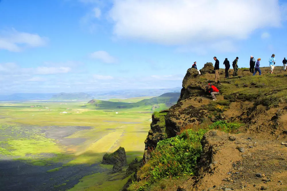 Unser Wanderziel können wir von unserer Unterkunft aus bereits sehen: der dreispitzige Berg Þríhyrningur. Das zunächst idyllisch-grüne Farmland verwandelt sich bald in typisch südisländisches, steiniges Gelände. Von dem Gipfel des Berges aus haben wir einen wunderbaren Blick über die fruchtbare Südküste (GZ: 3,5 Std., +/- 550 m).