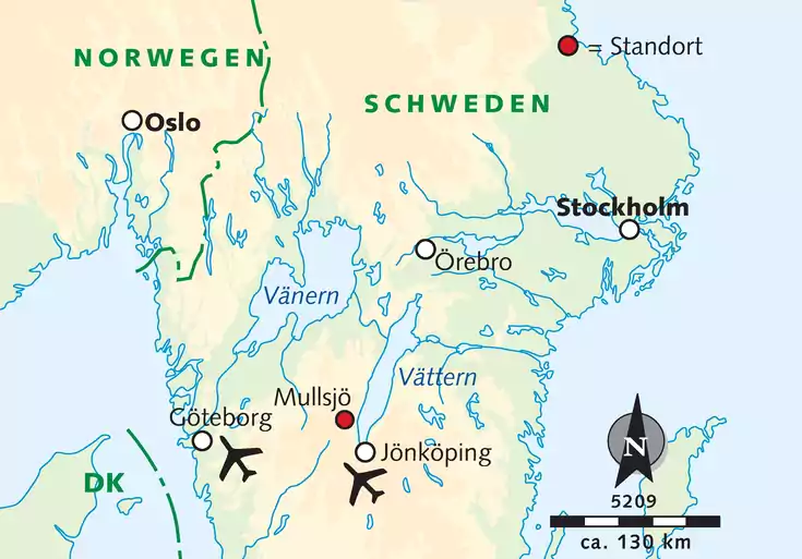 Flug nach Schweden und Transfer zum Hotel in Mullsjö.