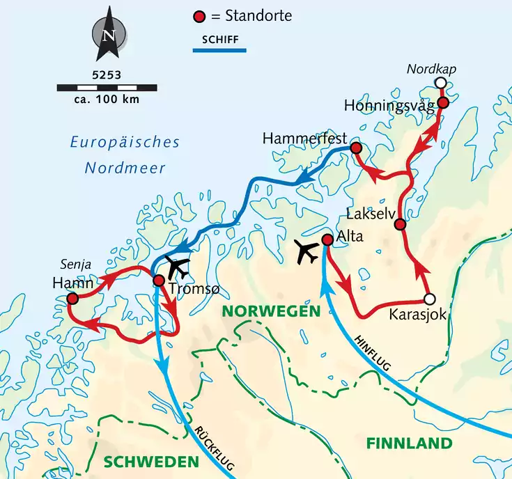 Auf unserer Reise durch Norwegens nördlichste Provinz Troms und Finnmark ist die Sonne unser ständiger Begleiter, denn all unsere Standorte befinden sich weit nördlich des Polarkreises. Hier treffen wir natürlich auch die indigene Volksgruppe, die Samen, die heute noch mit ihren Rentierherden durch die Lande ziehen. Tromsø, Hammerfest, Karasjok, Alta – um nur einige faszinierende Orte zu nennen – ziehen uns während dieser Reise in ihren Bann. Natur pur erleben wir auf der Insel Senja.