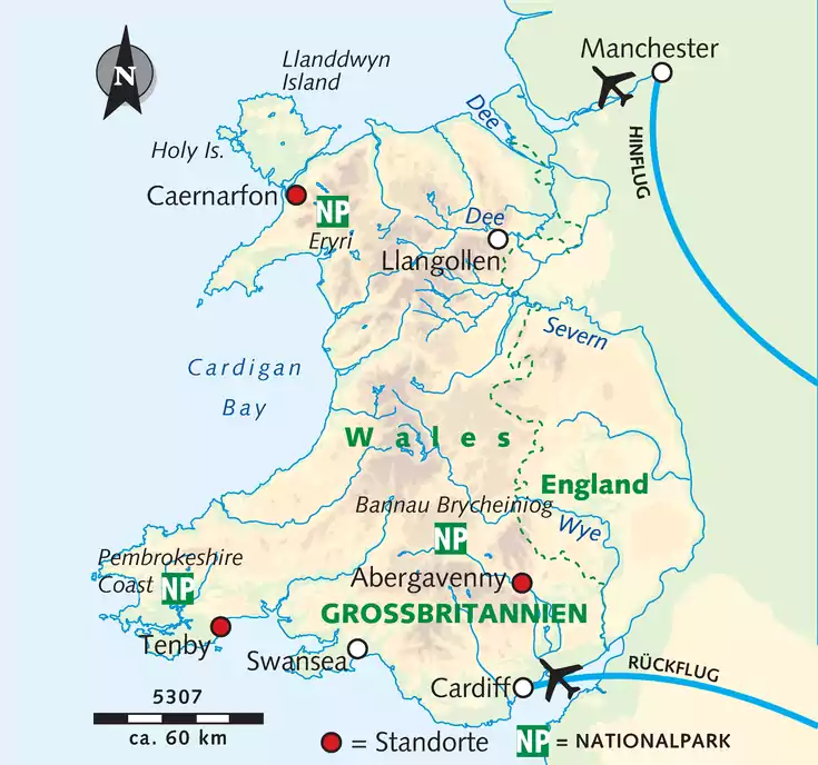 Wales präsentiert sich kontrastvoll. Liebliche Hügellandschaften mit saftig-grünen Wiesen und malerischen Dörfern wechseln sich ab mit wilden, einsamen Gebirgslandschaften, Hochmooren und verwunschenen Seen. Zwischen steilen Klippen liegen idyllische Badebuchten und weite, feinsandige Strände. Abwechslungsreich wie die Natur sind auch die Waliser. Obwohl sie seit Jahrhunderten zu Großbritannien gehören, pflegen sie noch heute ihre eigene Sprache, singen Hymnen und halten den roten Drachen – Y Ddraig Goch auf Walisisch – als nationales Symbol in Ehren. Die Zeit scheint stehen geblieben zu sein. All dies spielt sich vor der prachtvollen Kulisse kultureller Vielfalt ab: in mittelalterlichen Gassen, vor geschichtsträchtigen Burgen, in Klosterruinen, herrlichen Gärten und lebhaften Badeorten aus viktorianischer Zeit.