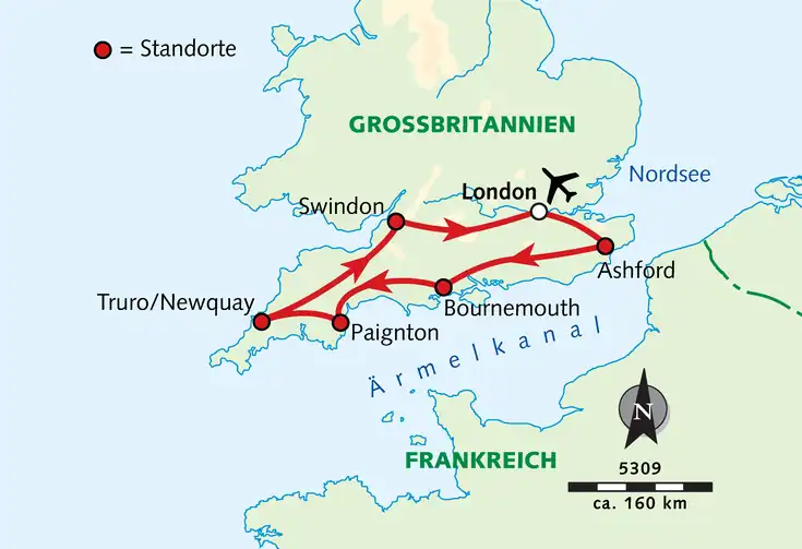 Flug nach London und Transfer zu unserem ersten Übernachtungsort Ashford/in der Region Kent (130 km, 3 Ü).