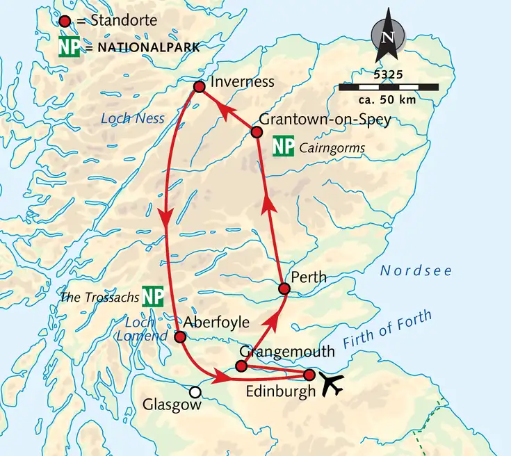 Flug nach Edinburgh und Transfer nach Grangemouth (30 km, 2 Ü). Je nach Ankunftszeit können wir noch das Callendar House, ein imposantes Herrenhaus mit über 600-jähriger Geschichte, besuchen (fakultativ).