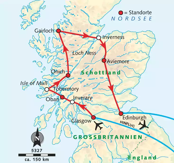 Flug nach Glasgow. Am Flughafen treffen wir nach der Landung auf unsere Reiseleitung und fahren gemeinsam zu unserem ersten Hotel (2 Ü).