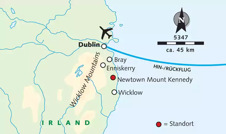 Flug nach Dublin, ca. einstündiger Bustransfer zum Hotel in Newtown Mount Kennedy.