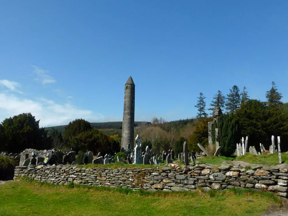 Die wohl größte Sehenswürdigkeit in den Wicklows ist die ehemalige Klostersiedlung Glendalough (gälisch für „Tal der zwei Seen”), mit deren Bau im 6. Jahrhundert begonnen wurde. Neben Kapellen, Ruinen der Kathedrale und keltischen Kreuzen beeindruckt vor allem der 33 m hohe Rundturm, der um das Jahr 1.000 erbaut wurde, um religiöse Reliquien und Bücher vor den einfallenden Wikingern zu schützen. Nach der Besichtigung beginnt die herrliche Wanderung durch das Glenealo-Tal, vorbei an Seen und einer alten Bleimine. Der Aufstieg auf einem schmalen Pfad führt uns zu einem mit Holzbohlen befestigten Weg entlang eines Steilhangs mit sensationellen Ausblicken über das ganze Tal (GZ: 4 1/2 Std., +/- 350 m).