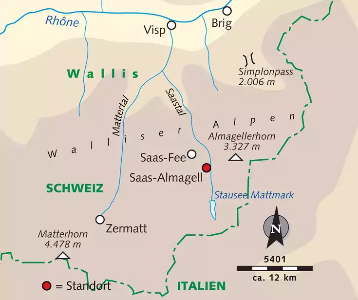 Nicht umsonst ist das Saastal eine der bekanntesten Regionen der Alpen. Achtzehn Viertausender mit den höchsten Bergen der Schweiz wie dem Monte-Rosa-Massiv und der Mischabelkette sowie unzählige Gletscher bieten eine grandiose Kulisse für unsere Wanderwoche. Unsere Unterkunft liegt auf 1.659 m Höhe, unterhalb von Saas-Fee in Saas-Almagell – die ideale Ausgangslage für einige der eindrucksvollsten Bergwanderungen der Alpen, bei denen wir uns überwiegend fernab des großen Rummels bewegen.