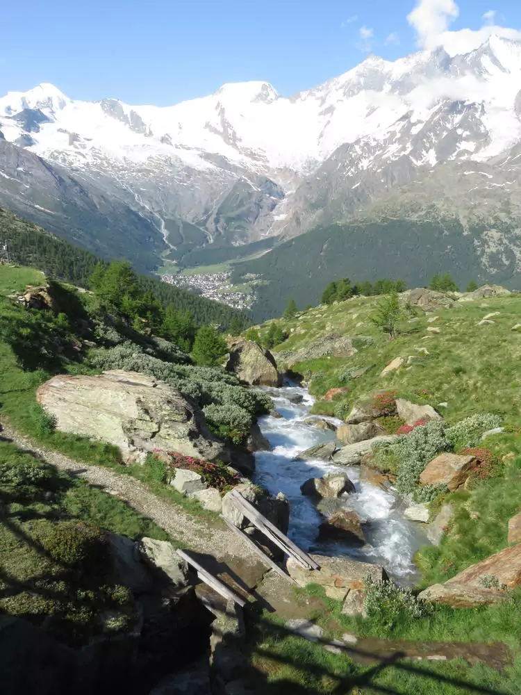 Mit der Seilbahn fahren wir hinauf auf 3.100 m, wo wir einen Blick auf 16 Viertausender haben. Wieder auf halber Höhe starten wir von der Station Trift (2.050 m) an einem riesigen Felsen vorbei durch einen Märchenwald und steigen dann vorbei an idyllischen kleinen Häuseransammlungen ab nach Saas Grund (GZ 3 1/2 Std., + 100 m, -500 m).
