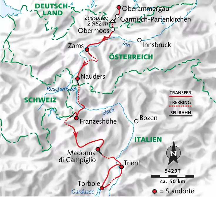 Spektakulärer kann der Einstieg dieser Tour über die Alpen nicht sein: Unter dem Gipfelkreuz der Zugspitze – am höchsten Punkt Deutschlands – beginnt unser Weg. Wir trekken auf den wohl schönsten Panorama- und Höhenwegen, darunter auf den Kaunertaler, Nauderer und Trafoier Panoramawegen. Flugs geht es in die bizarre Felsenwelt der Brenta-Dolomiten: Hunderte von Türmen und Zacken ragen in den Himmel. Am Monte Stivo, der letzten Gipfelüberschreitung in Richtung Süden, schimmert der Gardasee uns schon entgegen. Das Ziel ist erreicht!