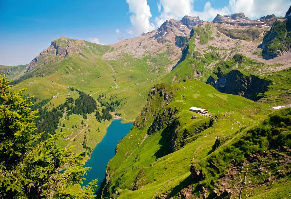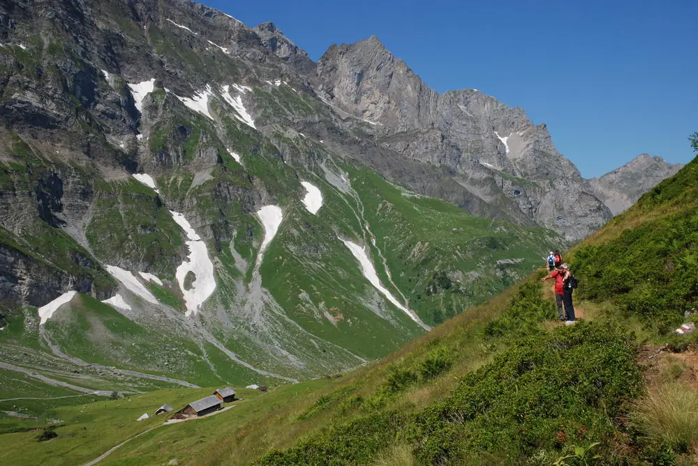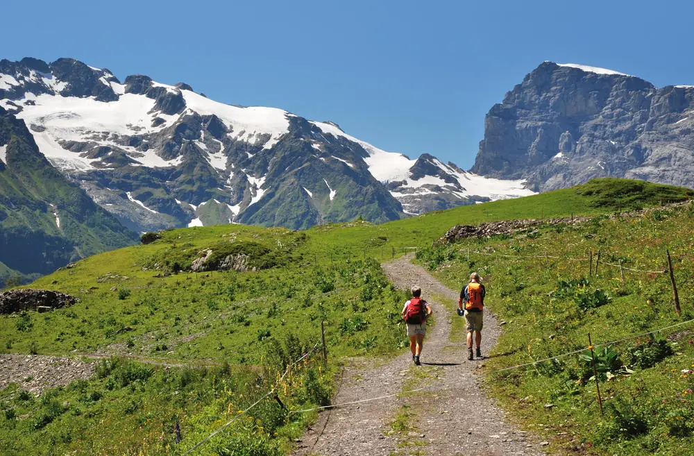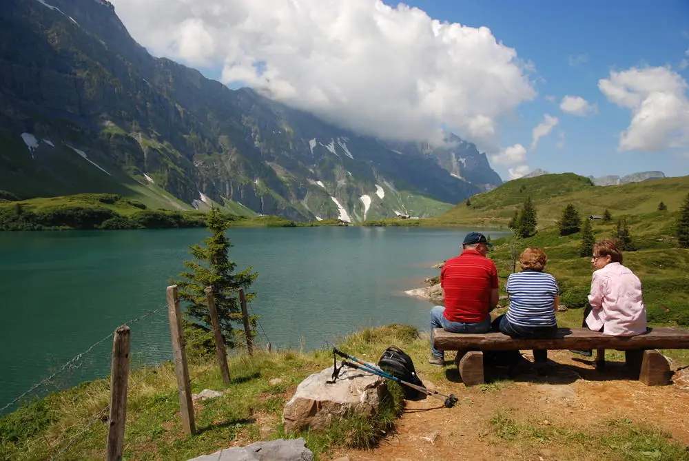Vom tiefgrünen See der Bannalp wandern wir hinauf zum Walenpfad, einem kühn angelegten Steig entlang der Nordhänge der Walenstöcke (gut gesichert und nur für sehr Schwindelanfällige ungeeignet). Bald ist mit Walegg, auf 1.951 m, der höchste Punkt erreicht. Danach wird es leichter, die Panoramen aber noch schöner. Der Weg erreicht die Brunnihütte mit einem Barfußweg (Kitzelpfad) rund um und im Härzlisee, die ideale Erholung für unsere Füße. Nach längerer Pause steigen wir über die Südhänge bis zu unserem Hotel ab (GZ: 5 1/2 Std., + 600 m, - 1000 m).