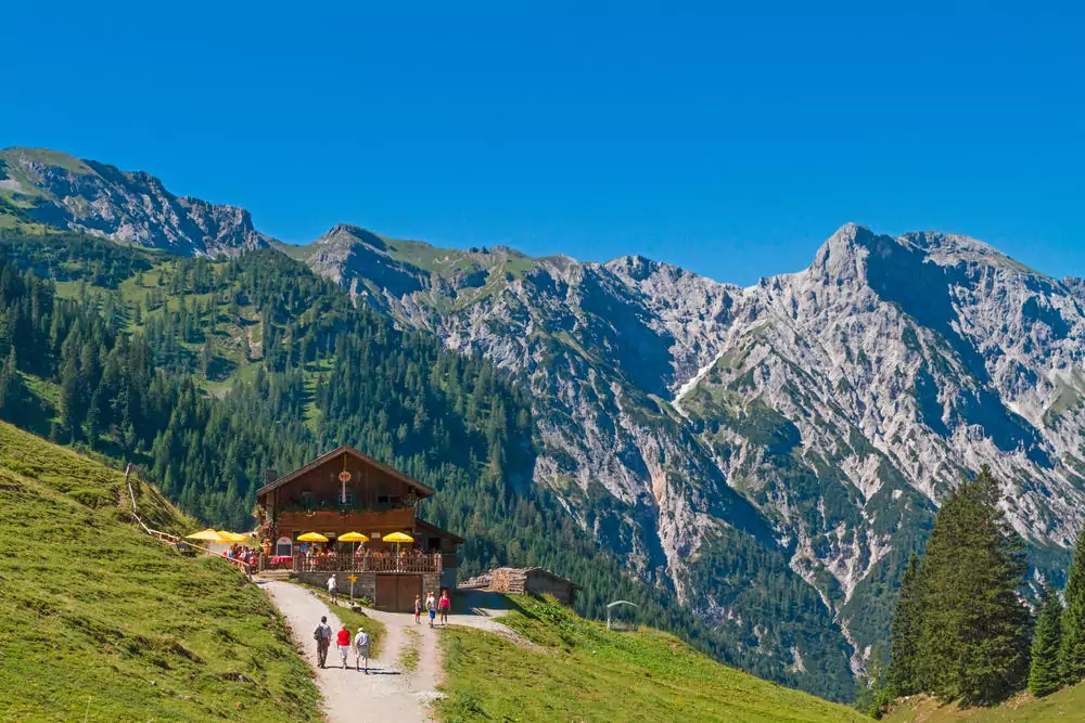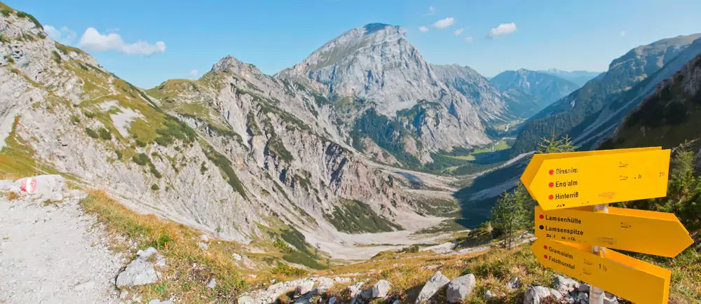 Transfer zur Gramai Alm. Über den Gramaier Grund steigen wir zur Lamsenjochhütte (1.953 m) auf. Ihre Lage ist einzigartig: Sie liegt am Fuße der Lamsenspitze und bietet ein imposantes Panorama auf die Karwendel-Gipfel. Über den Binssattel wandern wir wieder ins Tal zurück (GZ: 6 Std., +/- 700 m).