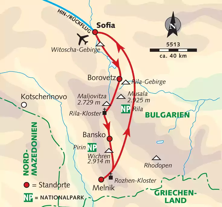 Flug nach Sofia und Transfer (75 km, 1 1/2 Std.) nach Borovetz (4 Ü).