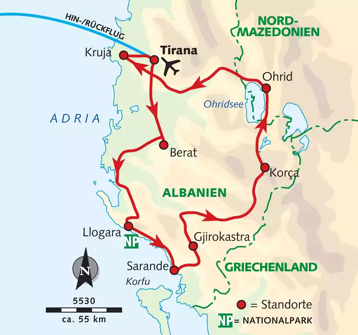Wir übernachten im Llogara-Nationalpark, in Berat und in Gjirokastra in einfachen Hotels, die der Zwei-Sterne-Kategorie entsprechen. In Sarande übernachten wir in einem Fünf-Sterne-Hotel. In Korça werden wir in einem Vier-Sterne-Hotel untergebracht. In Kruja verbringen wir die Nacht in einem kleineren Drei-Sterne-Hotel, in Tirana im Vier-Sterne-Hotel. Das Hotel in Ohrid ist nicht klassifiziert, entspricht aber drei Sternen. Die Zimmer in den einzelnen Unterkünften sind teilweise in Größe und Ausstattung sehr unterschiedlich. Die Übernachtungsorte entnimmst du dem Reiseverlauf (Ü = Übernachtung).
