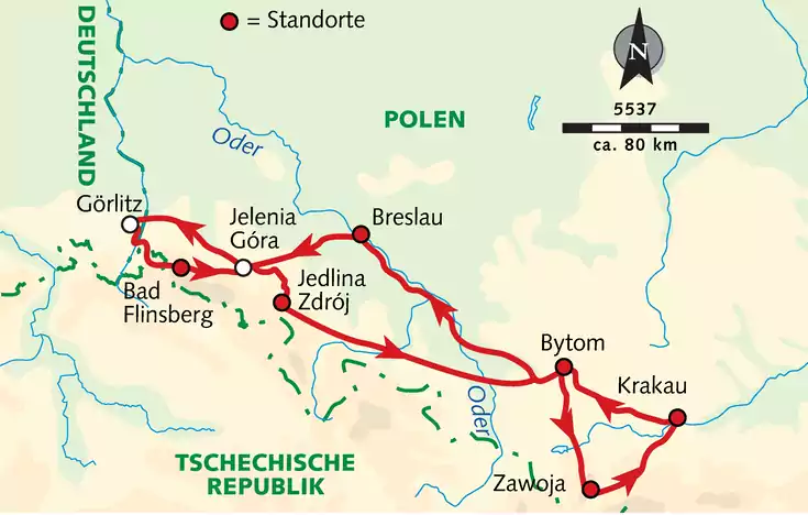 Hohe Berge, tiefe Stollen – nichts anderes als Gebirge und Bergbau prägt die schlesische Landschaft. Denn im Süden reiht sich eine Bergkette an die andere. Und in Oberschlesien gehören Zechen immer noch zum Stadtbild. Doch Schlesien ist viel mehr: reizvolle Städte wie Breslau. Oder das Hirschberger Tal mit seinen Palästen – eine architektonische Pracht. Neben den Besichtigungen in Breslau, Krakau und Oberschlesien entdecken wir auch die schönsten Berglandschaften Südpolens. Komm also mit und entdecke den Zauber Schlesiens!