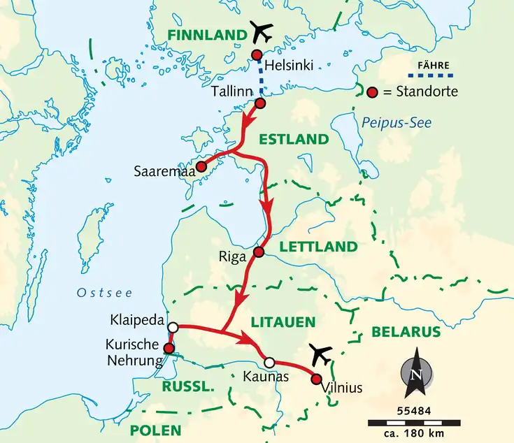 Begleite uns auf einer abwechslungsreichen Reise entlang der Ostsee. Wir starten in der quirligen finnischen Hauptstadt Helsinki. Gesäumt wird unsere Reise von kulturellen Höhepunkten in Hansestädten wie Tallinn und Riga und malerischen Schönheiten wie der Insel Saaremaa. Vorbei an Nida setzen wir unseren Weg bis nach Vilnius fort. Neben Saaremaa bietet uns auch die Kurische Nehrung einen schönen Kontrast zu unseren Städteerlebnissen mit weitläufigen Dünenlandschaften und weißen Sandstränden.