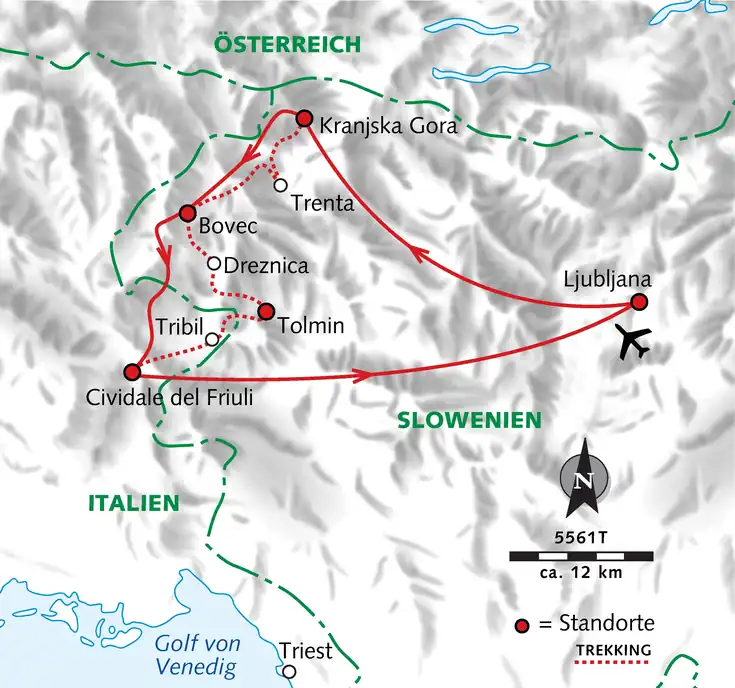 Zackige Gipfel, saftige Wiesen und das smaragdfarbene Wasser der Soča – auf unseren fünf Etappen des Fernwanderweges queren wir Slowenien von Nord nach Süd, bevor wir nach Norditalien weiterreisen. Hauptsächlich im nichtalpinen Bereich angesiedelt, richtet sich der Alpe-Adria-Trail in erster Linie an Genusswanderer. Auf unseren Wanderungen erkunden wir neben sanften Tälern, Schluchten und gemütlichen Ortschaften auch die geschichtsträchtige Vergangenheit der Region im Dreiländereck von Österreich, Italien und Slowenien.
