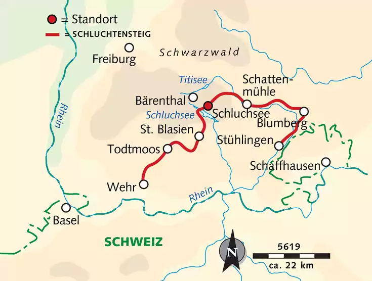 Wie ein Bogen spannt sich der Schluchtenweg von Stühlingen über Aha-Schluchsee und St. Blasien bis nach Wehr. Wir wandern diesen erlebnisreichen Weg voller Natur-Highlights vom Start bis zum Ziel komplett ab, ohne das Hotel zu wechseln. Sechs Tagesetappen von 18 bis 22 km zeigen uns auf schmalen Pfaden und schönen Wanderwegen großartige Naturschauspiele wie die Schluchten von Wutach, Gauchach, Lotenbach und Hohwehra oder auch die Schleifenbach- und Windberg-Wasserfälle. Aber keine Angst: Es wird nicht nur nass! Wir wandern auch über aussichtsreiche Höhen, am weiten Schluchsee entlang und passieren freundliche Orte wie Lenzkirch oder St. Blasien mit der riesigen Domkuppel. Hochmoore, Blumenwiesen und Kühe auf satten Weideflächen sehen wir am Wegesrand.