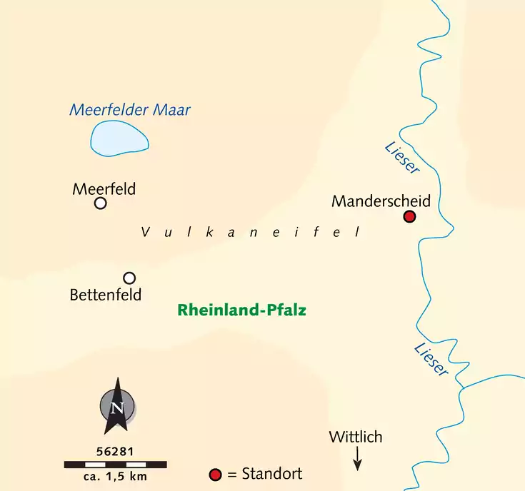 Ausgangspunkt für unsere Wanderung ist Weiersbach. Durch idyllische Flusstäler und an einer Mineralquelle vorbei wandern wir meist auf einfachen Wegen. Bei einem Abstecher zum Eckfelder Trockenmaar können wir eine der bedeutendsten Fossilien-Fundstätten Europas sehen. Berühmt wurde sie insbesondere durch das Skelett des „Eckfelder Urpferdchens“. Am Nachmittag erreichen wir wieder Manderscheid (GZ: 4 Std., + 45 m, - 120 m) und statten dem Maarmuseum einen Besuch ab. Schwerpunkt der Ausstellungen sind die Geschichte und Entstehung der „Augen der Eifel“. Ein Museum zum Anfassen und Erleben!