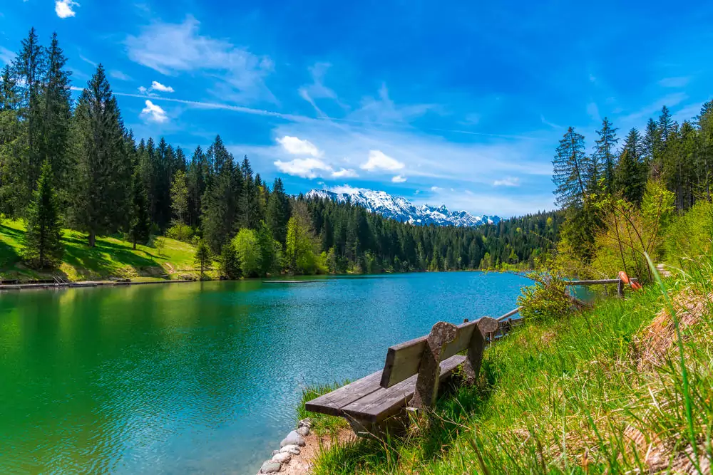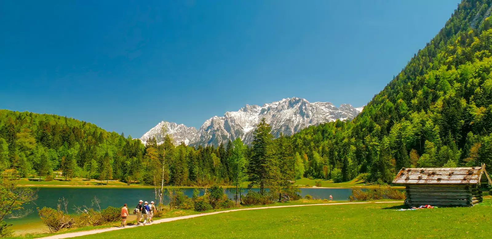 Je nach Lust, Fitness und Wetter fahren wir entweder mit dem Einer-Sessellift der Kranzbergbahn in 15 Min. zur Bergstation oder wandern auf kleinen Wegen hinauf (GZ: 1 1/2 Std., + 300 m). Von hier sind es noch 150 Höhenmeter bis zum Gipfel des Kranzberges (1.391 m). Der 360°-Rundumblick ist phänomenal: Vor uns liegen die Felswände des Karwendelmassivs, rechts davon die beiden Gipfel des Wettersteins, etwas weiter die Zugspitze. Auf einem schönen Waldpfad steigen wir hinab zum Ferchensee. Hier können wir einkehren oder direkt am Westufer des Ferchensees weiterwandern. Bei Windstille spiegeln sich die umliegenden Berge auf der Wasseroberfläche – einmalig! Weiter geht es zum Lautersee und durch eine wildromantische Schlucht zurück zum Hotel (GZ: 3 Std., + 200 m, - 500 m).
