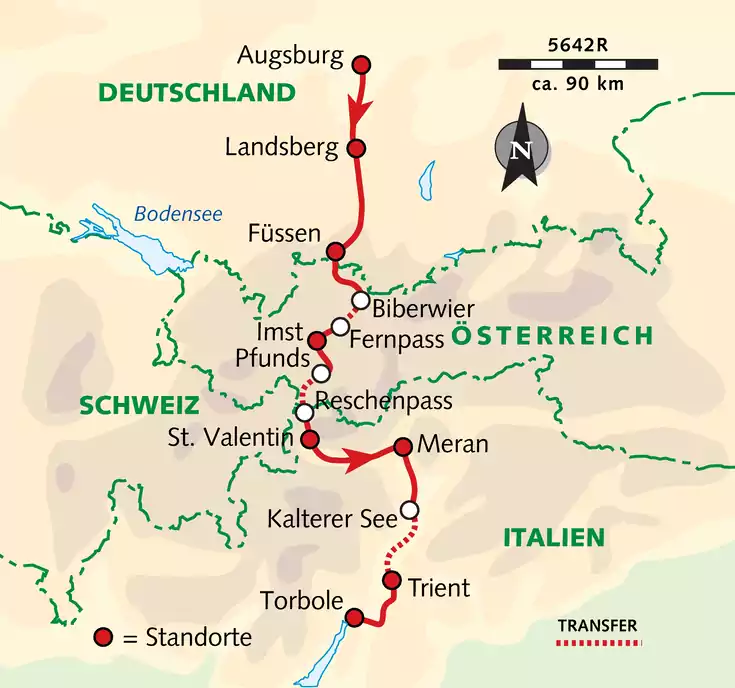Kurz hinter Füssen passieren wir den Lechfall sowie die deutsch-österreichische Grenze und radeln nach Reutte. Auf dem historischen Verlauf der Via Claudia Augusta durchqueren wir das Tiroler Land. Ab Lermoos überwinden wir die verkehrsreiche Strecke über den Fernpass per Bustransfer. Vom Schloss Fernstein radeln wir via Nassereith durch das malerische Gurgltal nach Imst. (1 Ü)