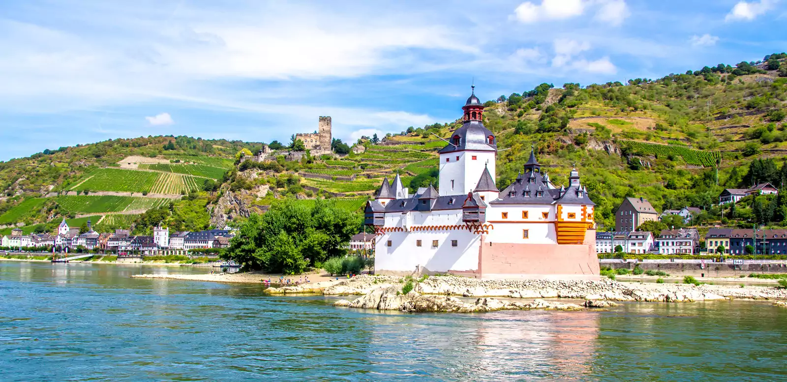 Unser heutiges Wanderziel ist das mittelalterlich geprägte Kaub. Weltberühmt thront auf einer kleinen Insel im Rhein der Pfalzgrafenstein. Der Wanderweg bietet Genusswandern pur. So wechseln kurze steile Anstiege mit flachen Panoramaabschnitten, die den Blick auf die andere Rheinseite freigeben. Drüben erkennen wir Bacharach, die heimliche Hauptstadt der Rheinromantik. Immer wieder schwenken wir auch kurz in Nebentäler ein, bevor wir uns am Ziel angekommen, mit einer Einkehr in einem der zahlreichen Restaurants belohnen (GZ: ca. 4 Std., +/- 500 m).