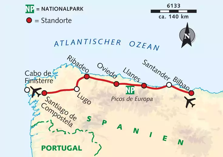 Wir übernachten an fünf Standorten entlang des nördlichen Jakobswegs: Vom modernen Bilbao geht es ins charmante Seebad Llanes und weiter ins historische Oviedo. In Ribadeo erleben wir Küstenidylle pur, bevor wir am Ziel aller Pilger ankommen: Santiago de Compostela. Frühstück gibt es an allen Standorten im Hotel. Die inkludierten Abendessen finden teils im Hotel und teils in ausgewählten Restaurants statt. In Bilbao, Llanes, Oviedo und Ribadeo hast du jeweils an einem Abend die Gelegenheit, die regionale Küche ganz nach deinem Geschmack selbst zu erkunden.