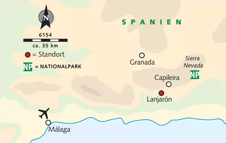 Hotel: Unser familiengeführtes Drei-Sterne-Hotel Alcadima begeistert mit seiner liebevoll gestalteten Anlage im andalusischen Stil. Schattige Innenhöfe, ein gepflegter Garten mit Pool und kleine Rückzugsorte schaffen eine entspannte Atmosphäre. Zimmer: Die 50 gemütlichen Zimmer sind mit Klimaanlage, TV, Safe, Minikühlschrank, Wasserkocher und WLAN ausgestattet, einige verfügen zudem über einen Balkon oder eine Terrasse. Verpflegung: Frühstück und abends typisch andalusische Küche als Drei-Gänge-Menü. An einem Abend kochen wir gemeinsam unter Anleitung der Küchenchefin ein Menü. Lage: Das Hotel liegt ruhig am Ortsrand des Thermalbads Lanjarón, in den südlichen Ausläufern der Sierra Nevada – ideal als Ausgangspunkt für unsere Wanderungen.