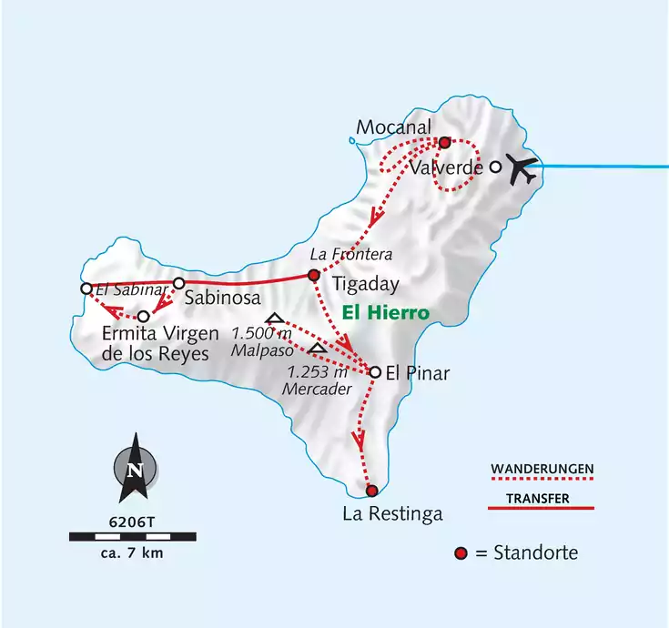 Weiterreise nach El Hierro. Auf der ersten Wanderung lernen wir den Norden der Insel kennen. Unser Weg führt uns bis zur Abbruchkante im Nordwesten, wo wir einen fantastischen Blick ins Golfo-Tal haben (GZ: 3 1/2 Std., +/- 350 m).