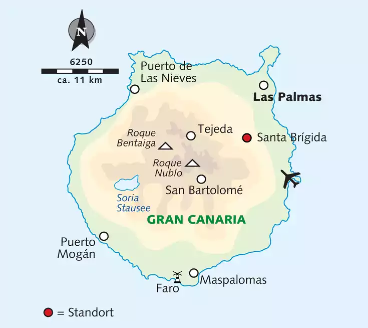Hotel: Das Vier-Sterne-Hotel Escuela Santa Brígida gehört zur Hecansa-Gruppe, der Hotelfachschule der Kanarischen Inseln. Das Hotel befindet sich in einem über 100 Jahre alten Gebäude, hat nur 40 Zimmer und verfügt über eine Gartenanlage sowie eine Sauna. Zimmer: Die komfortablen Zimmer sind ausgestattet mit Sat-TV, Safe, Minibar (gegen Gebühr), WLAN, Klimaanlage/Heizung und Föhn. Balkonzimmer mit Gartenblick sind auf Anfrage gegen Aufpreis buchbar. Verpflegung: Frühstück im Hotel. An vier Abenden essen wir ebenfalls im Hotel. Zwei Mittagessen finden in auswärtigen Restaurants statt. Lage: Das Hotel liegt in der Wohngegend El Monte Lentiscal. In unmittelbarer Umgebung gibt es mehrere Restaurants sowie eine Bushaltestelle mit Anbindung zur Hauptstadt Las Palmas, zum Strand Las Canteras sowie zu den bekannten Dünen von Maspalomas.