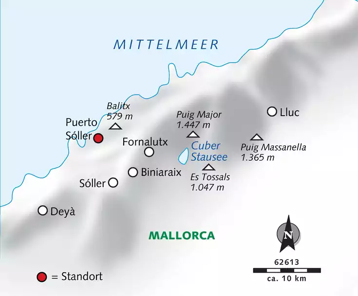 Vom Cúber-Stausee aus führt uns der vorwiegend felsige Weg über die drei Gipfel Sa Rateta (1.113 m), Na Franquesa (1.067 m) und L´Ofre (1.091 m). Über das Tal von Bini Morat wandern wir zurück (GZ: 5 1/2 Std., +/- 700 m).