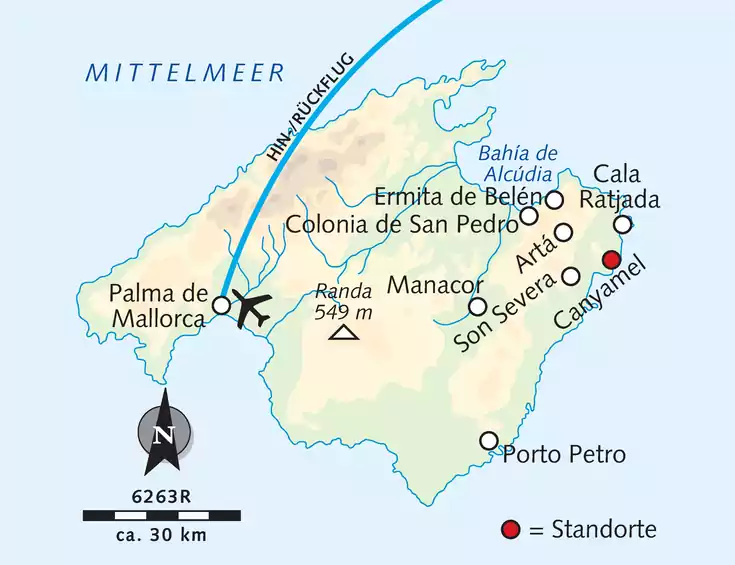 Transfer zum Ort Randa. Die Königsetappe führt uns von Randa quer über die Insel vorbei an Manacor und Son Servera zurück nach Canyamel.