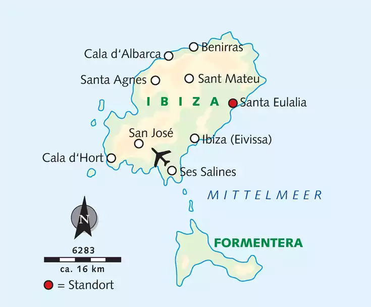 Ausgehend vom kleinen Ort San José steigen wir hinauf zum 475 Meter hohen Sa Talaia – dem höchsten Punkt Ibizas. Oben angekommen, erwartet uns ein weiter Rundumblick über die gesamte Insel. Danach führt der Weg hinab zur traumhaften Cala d’Hort, die mit ihrem karibischen Flair begeistert (GZ: 4 Std., + 270 m, - 475 m).